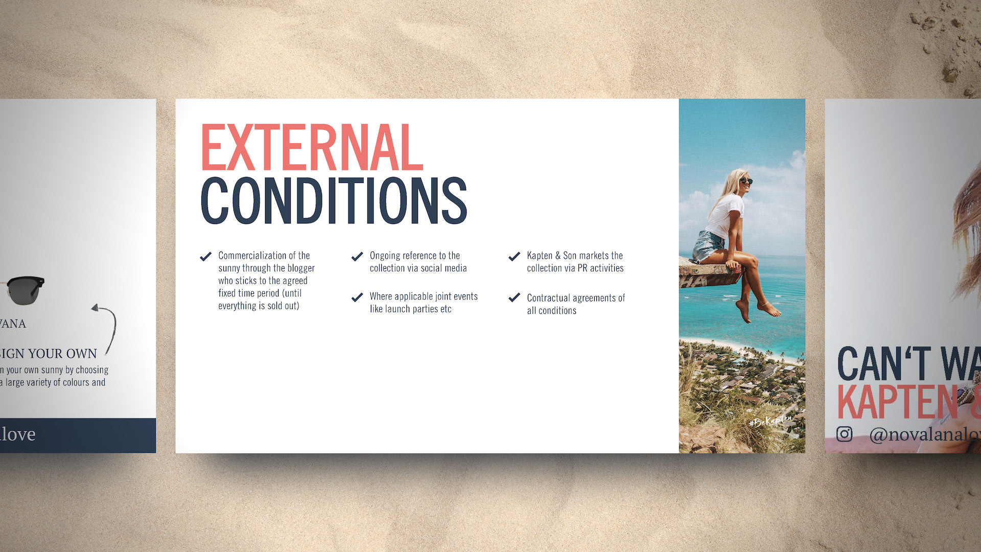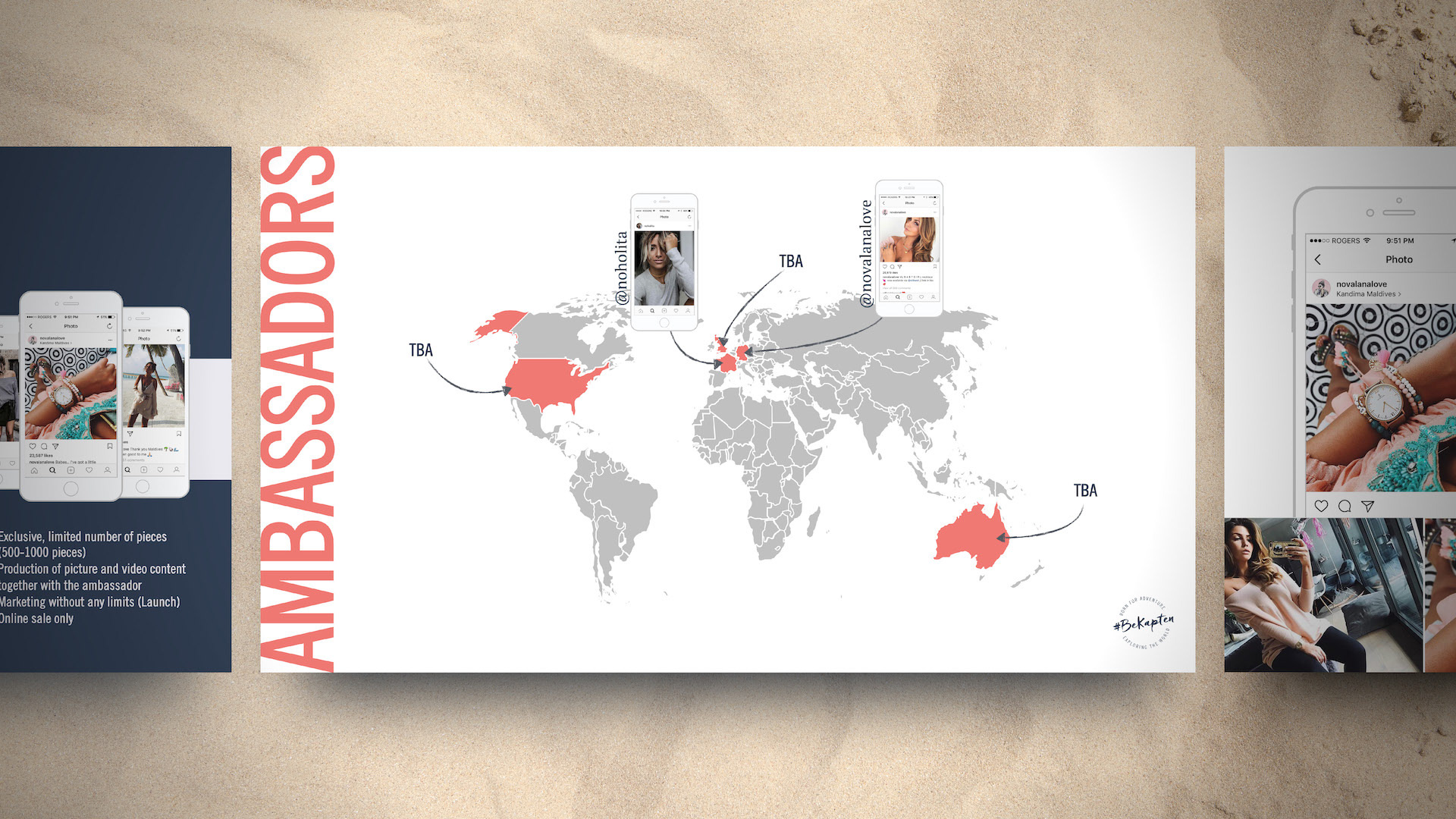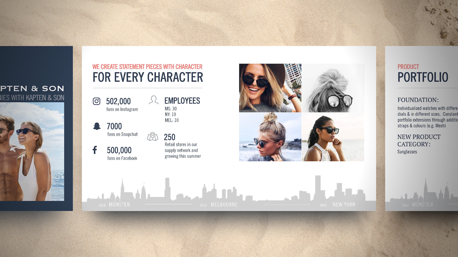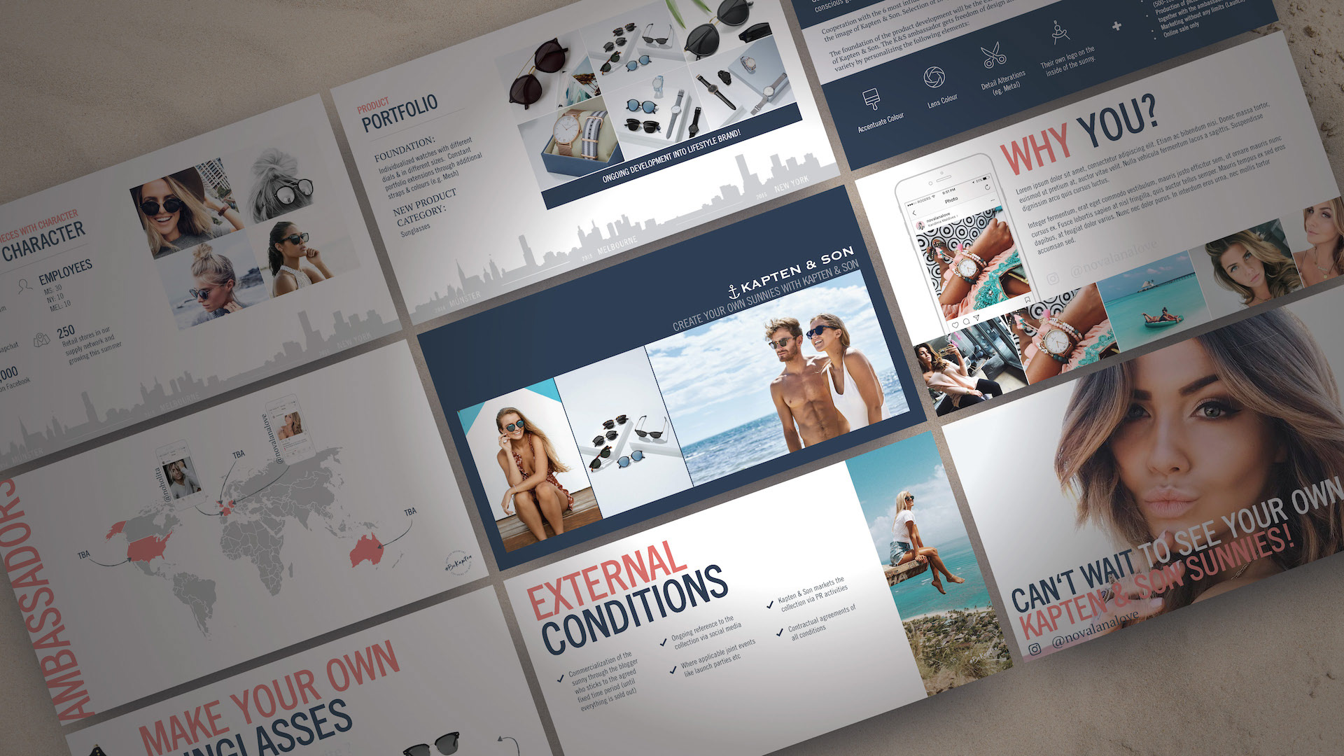 Kapten & Son already had a strong brand guide, so it made designing this series much easier. Throughout, I wanted to maintain a hint of nautical with a play between nautical blue overlays, and pearl white backdrops. I was also lifestyle photo-heavy, most of which are pieces from actual influencers wearing Kapten & Son products. I wanted influencers to see themselves in those photos, and I wanted them seeing the momentum already underway in the influencer community. Graphically, I laid out elements in a fun and engaging way, sometimes breaking rules and running large text off the slide. I also wanted to suggest a treasure map feel with dotted arrows between objects and maps that interacted with photos. Overall I'm pleased with how these turned out.
