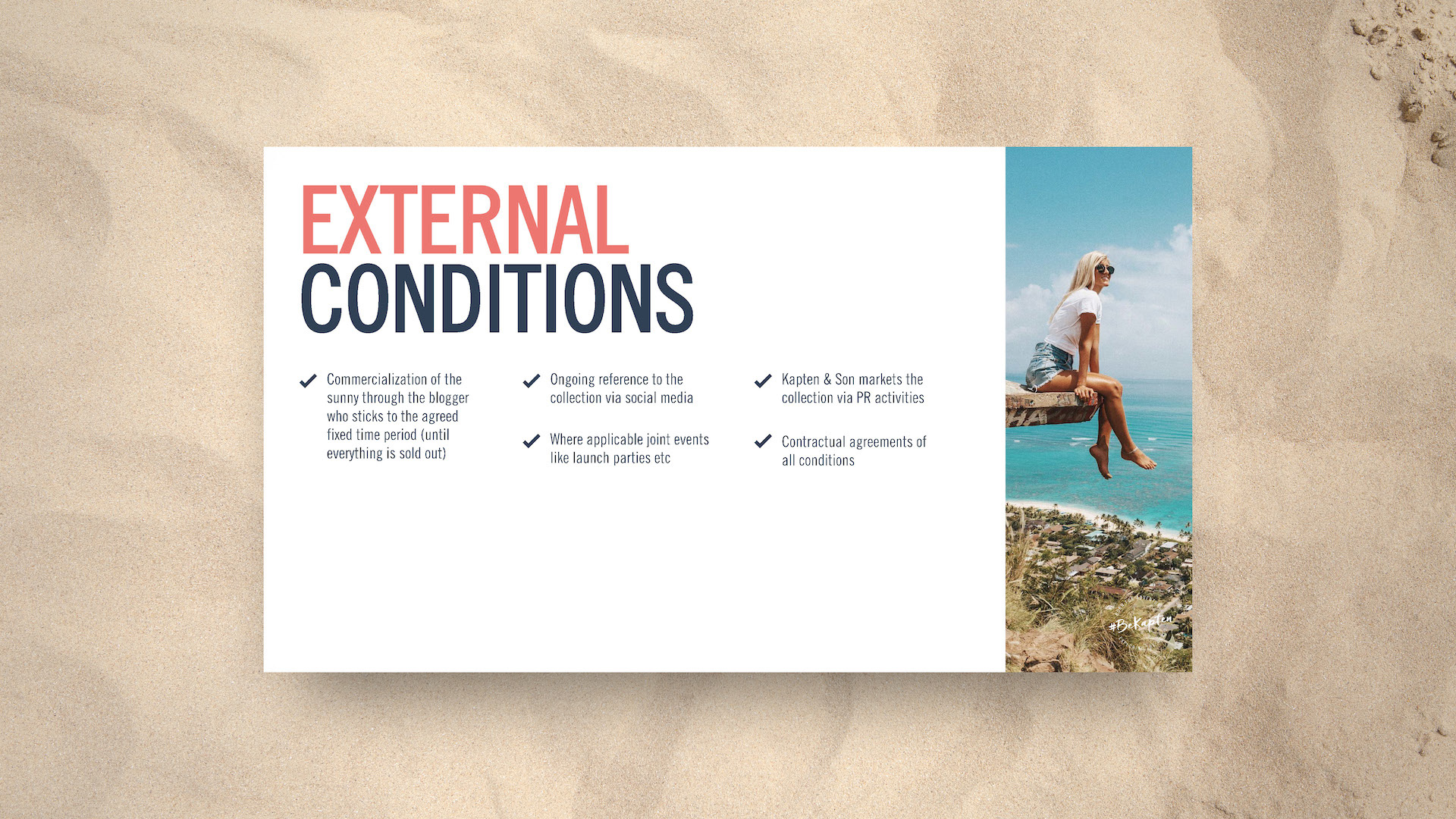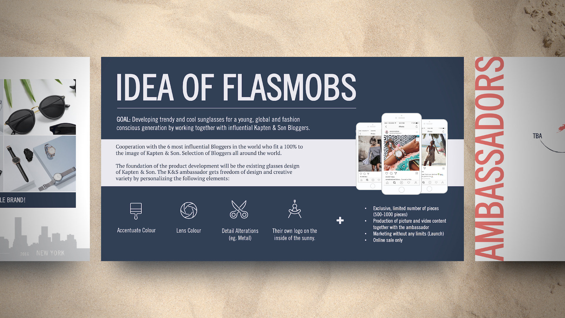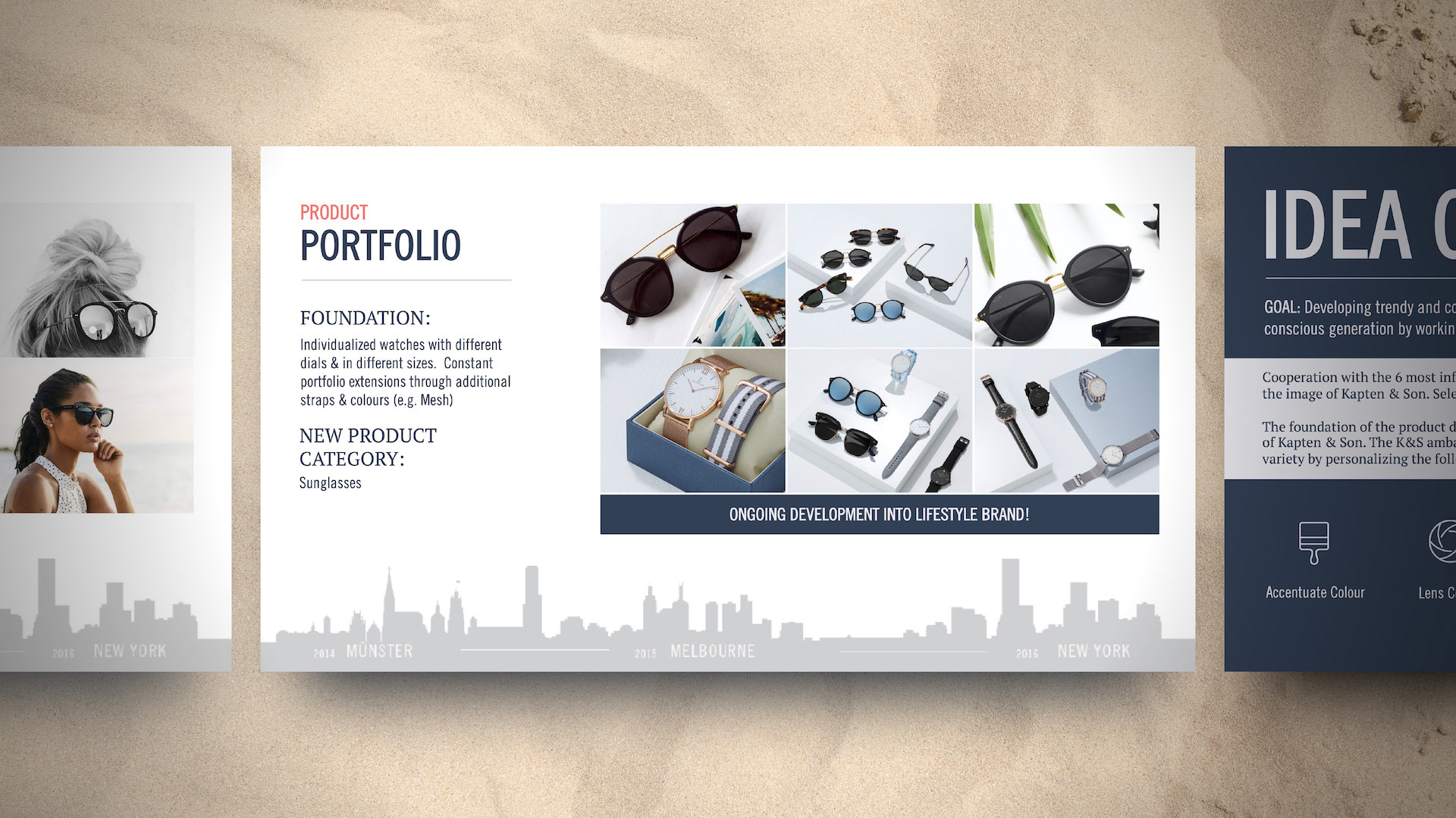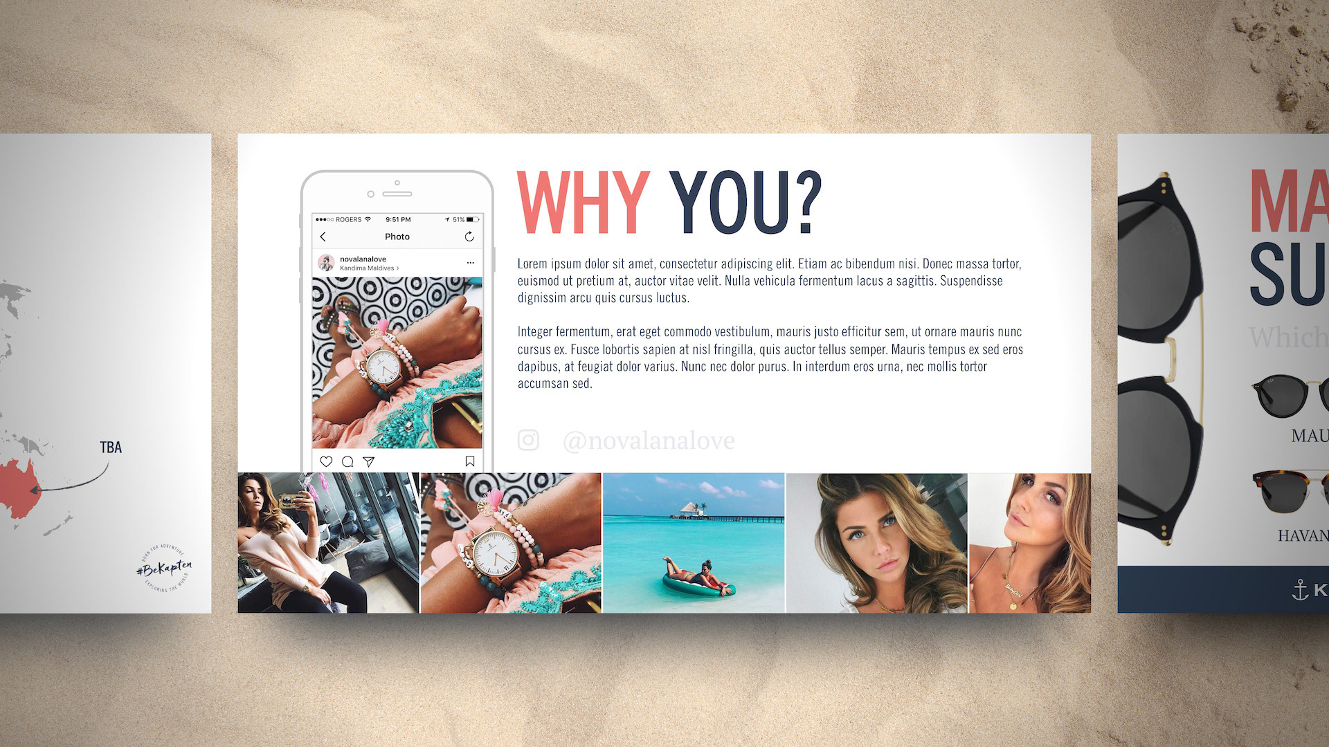 Kapten & Son already had a strong brand guide, so it made designing this series much easier. Throughout, I wanted to maintain a hint of nautical with a play between nautical blue overlays, and pearl white backdrops. I was also lifestyle photo-heavy, most of which are pieces from actual influencers wearing Kapten & Son products. I wanted influencers to see themselves in those photos, and I wanted them seeing the momentum already underway in the influencer community. Graphically, I laid out elements in a fun and engaging way, sometimes breaking rules and running large text off the slide. I also wanted to suggest a treasure map feel with dotted arrows between objects and maps that interacted with photos. Overall I'm pleased with how these turned out.