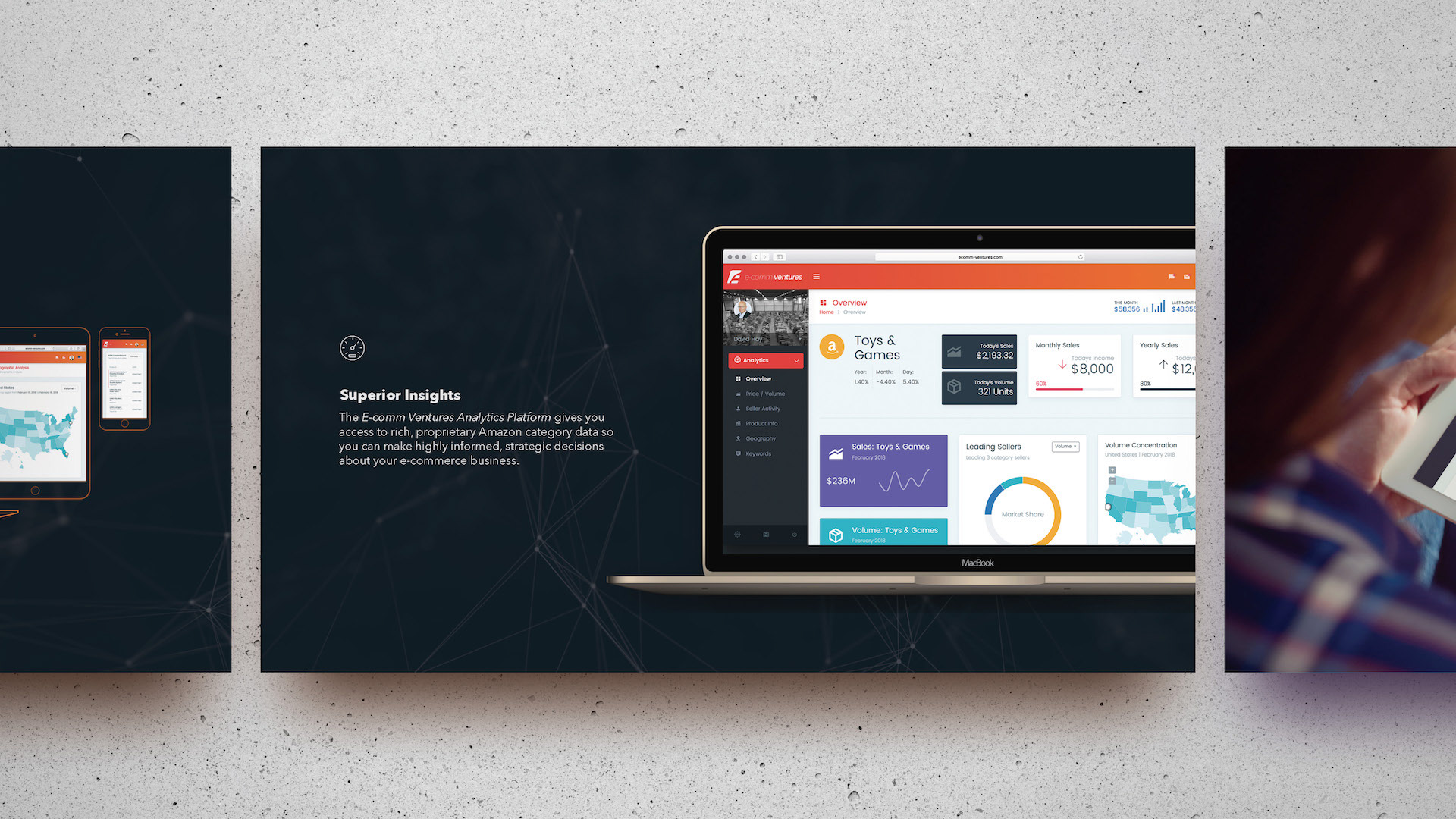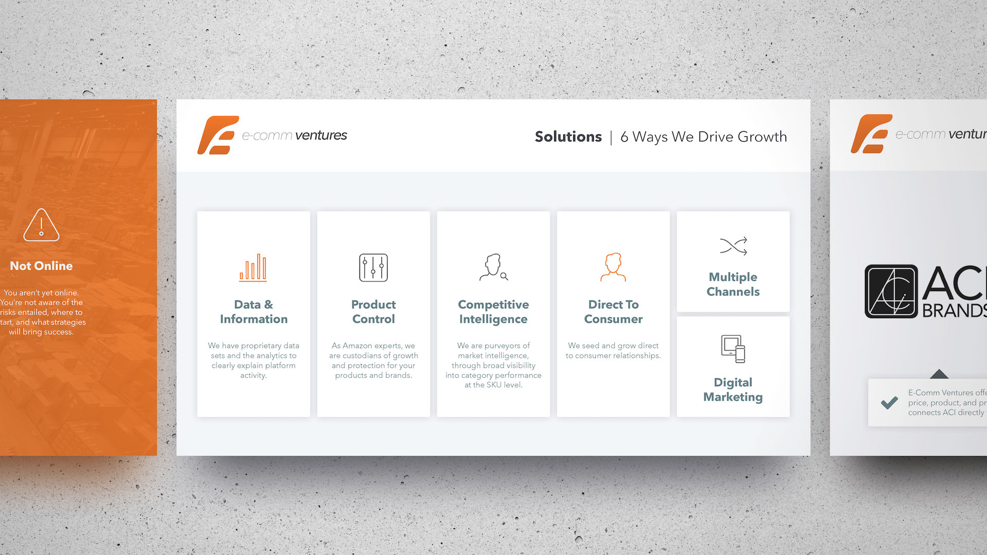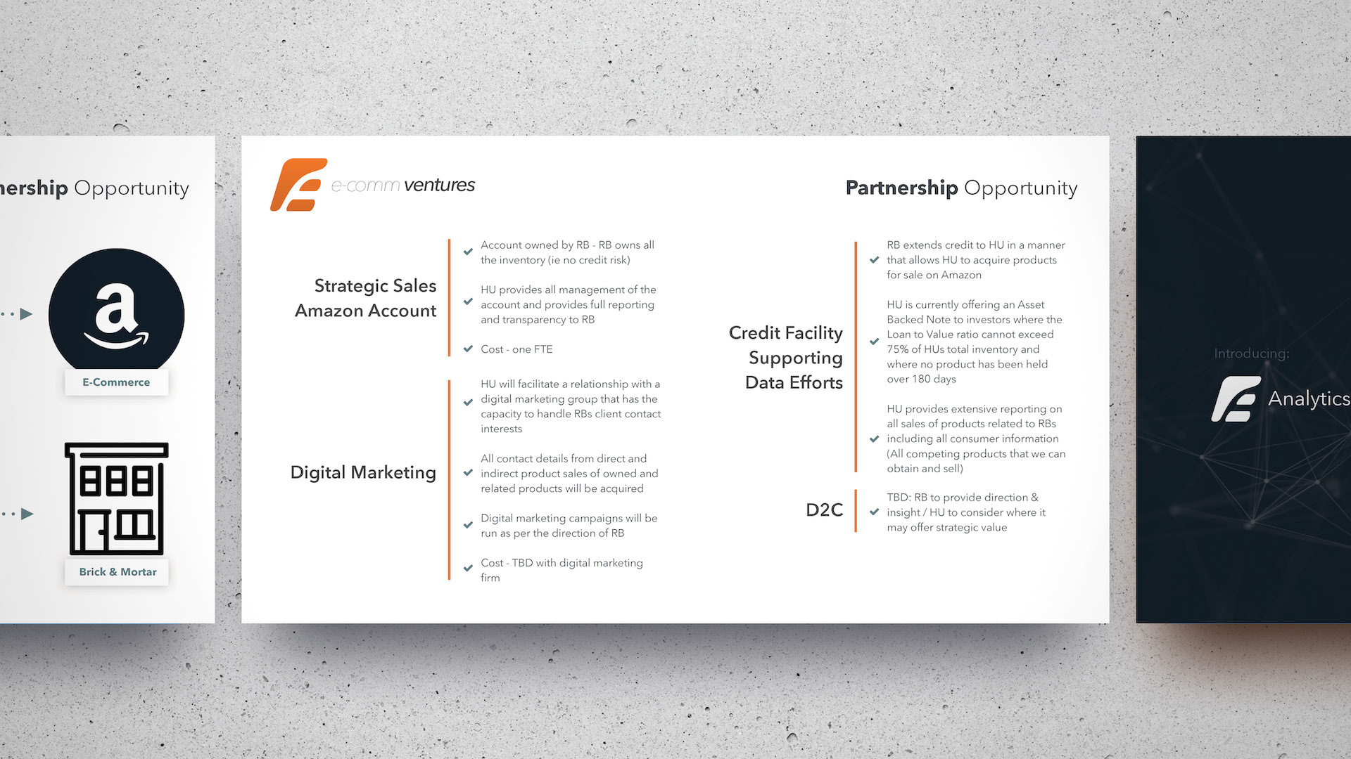 This presentation would be shown to executives and large offline retail supply chain managers so I wanted to capture a "shipping" feel similar to Fedex. The bright orange, and charcoal blacks with crisp whites set the stage for this mood. Graphically I needed to follow a classic business plan problem-solution narrative that convinced executives of this technology's potential. The second half of this presentation is pure design vision. I actually built an interactive prototype that was demoed alongside this presentation. Screenshots of the prototype are what you see laid out in the ending slides.