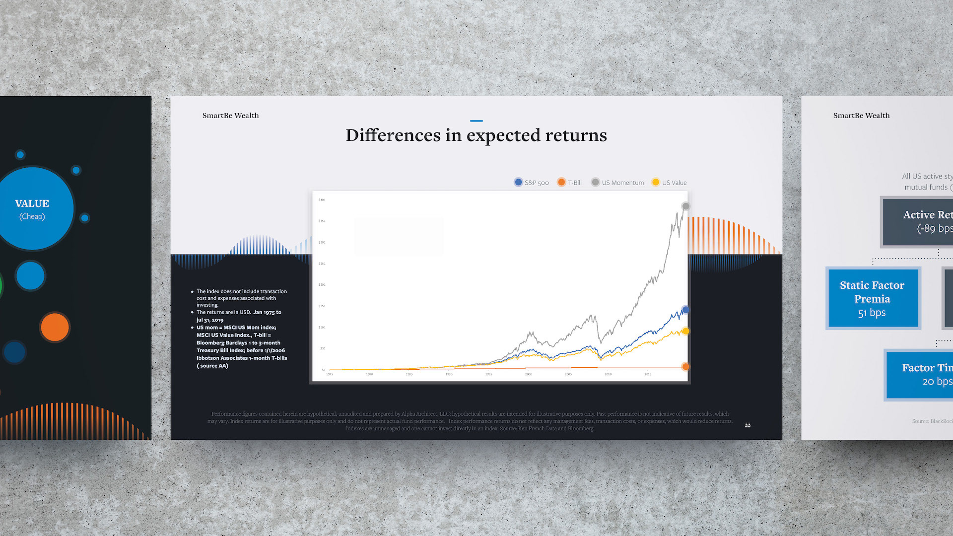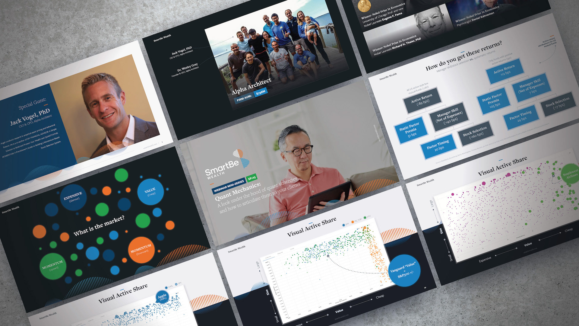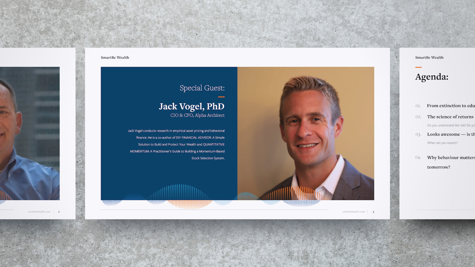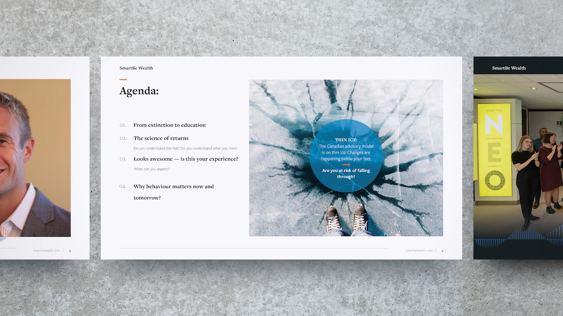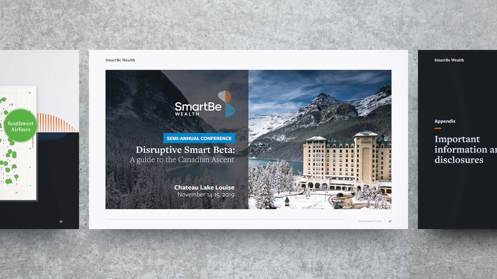 The SmartBe brand was built to steer clear of the classic cookie cutter investment manager brand look (vanilla lifestyle istock and "safe" colour schemes). SmartBe had previous invested in custom illustrations that thematically suggested attractive features of investing (risk aversion, sustainability etc). When designing this presentation series, I wanted to capture the friendly, smart, approachable brand roots SmartBe was planting. I accomplished this primarily with gentle fades, simplistic layouts and an abundance of whitespace.