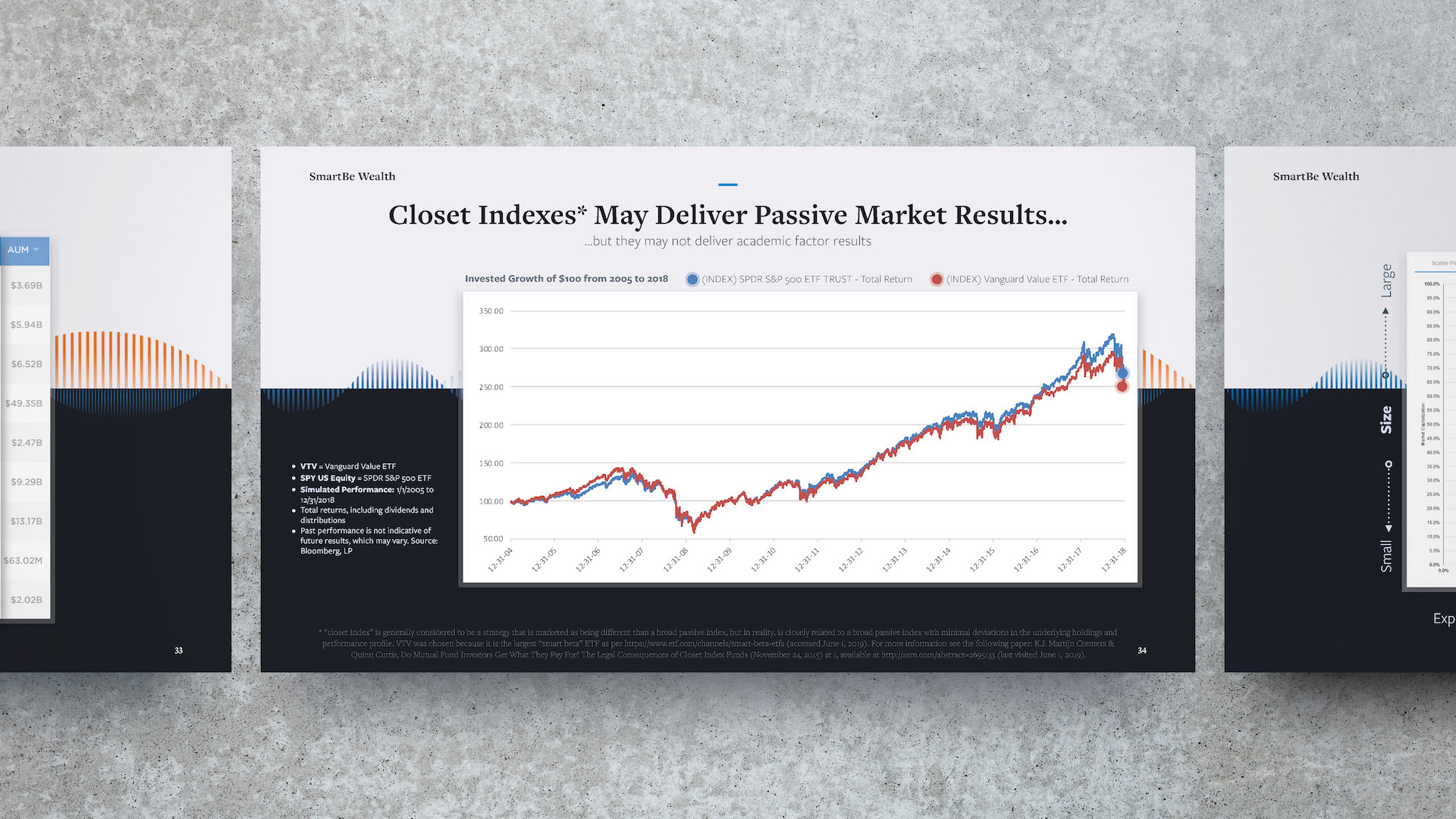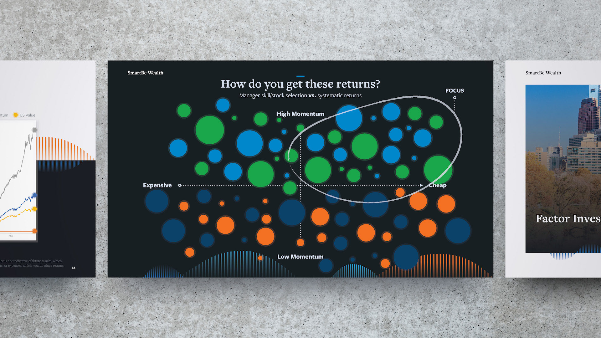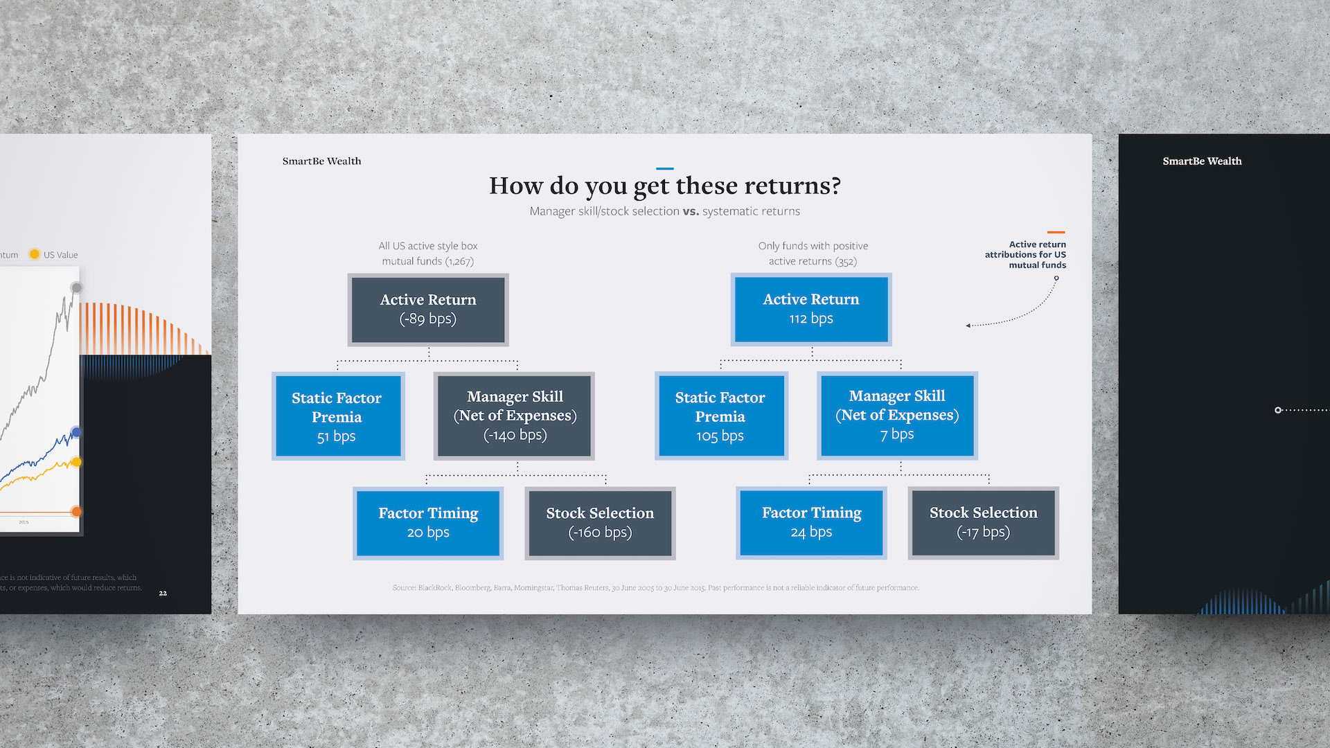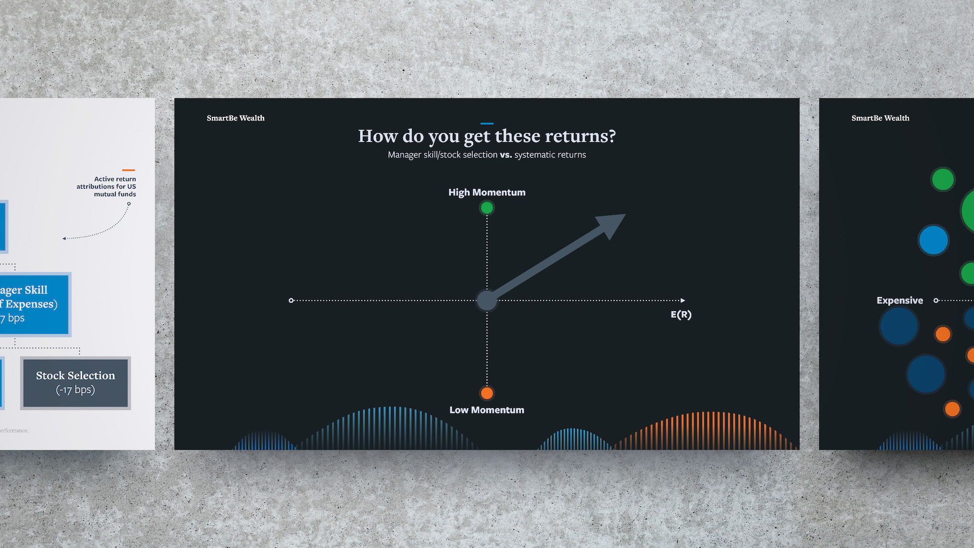 The SmartBe brand was built to steer clear of the classic cookie cutter investment manager brand look (vanilla lifestyle istock and "safe" colour schemes). SmartBe had previous invested in custom illustrations that thematically suggested attractive features of investing (risk aversion, sustainability etc). When designing this presentation series, I wanted to capture the friendly, smart, approachable brand roots SmartBe was planting. I accomplished this primarily with gentle fades, simplistic layouts and an abundance of whitespace.