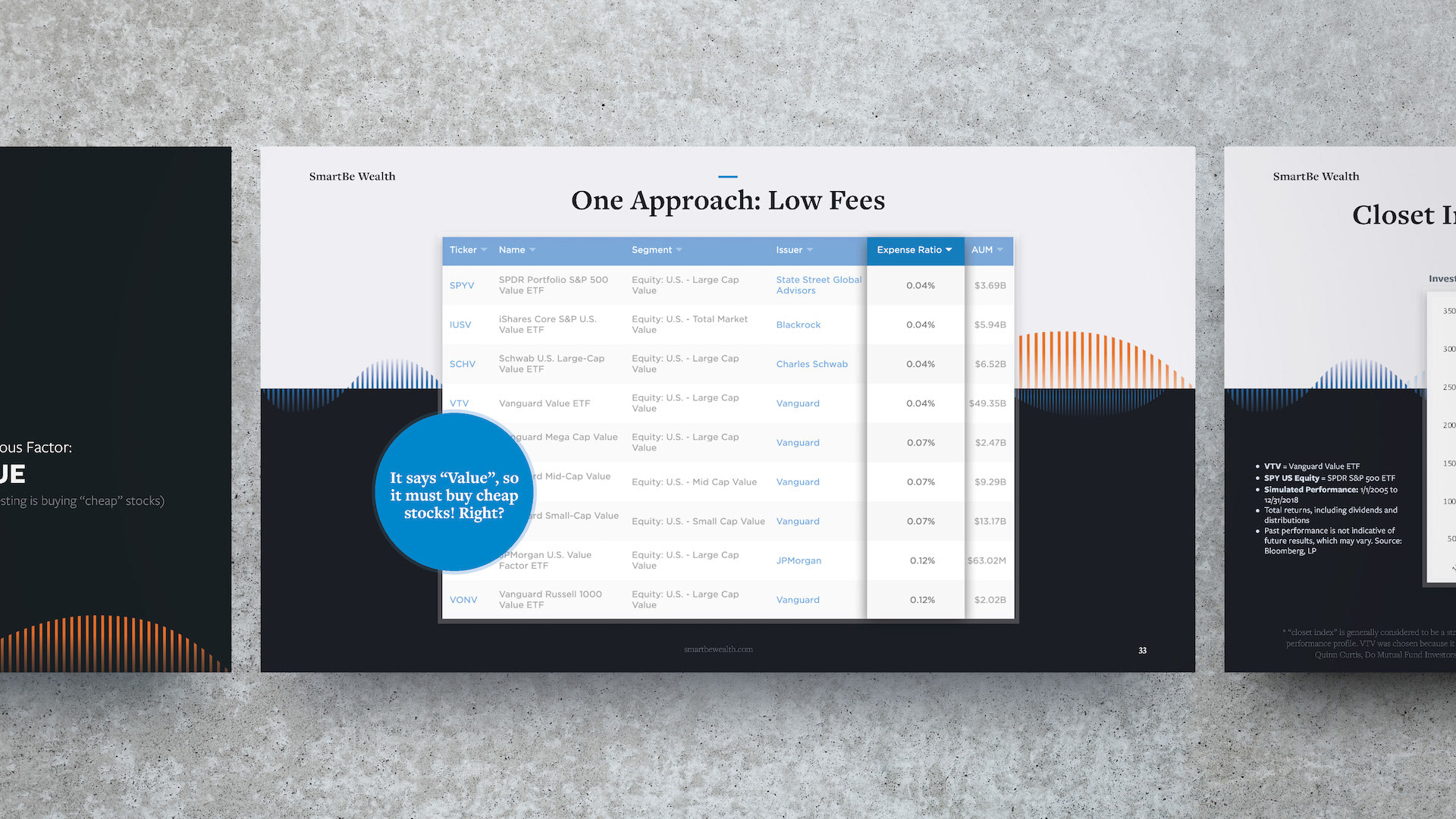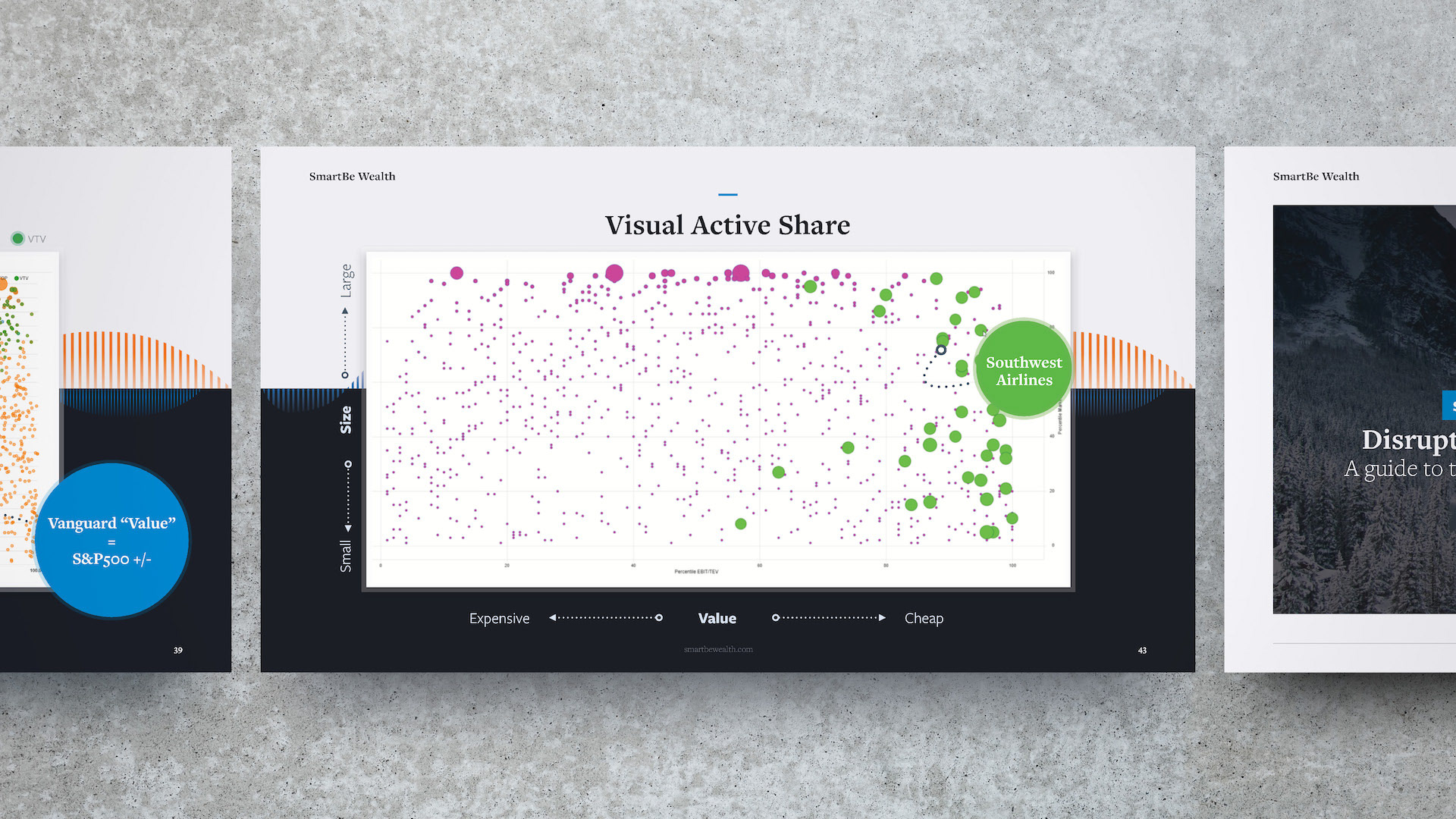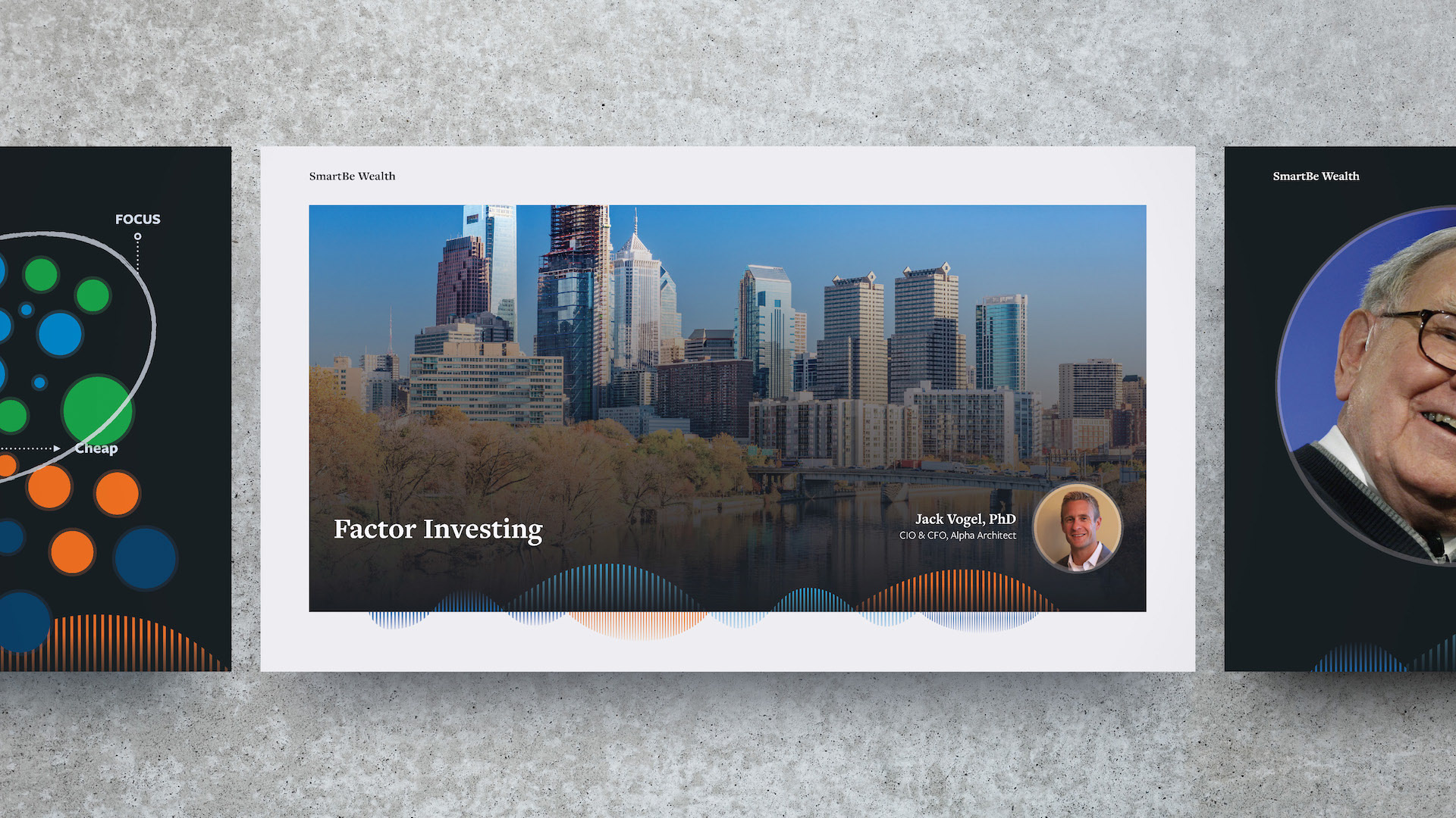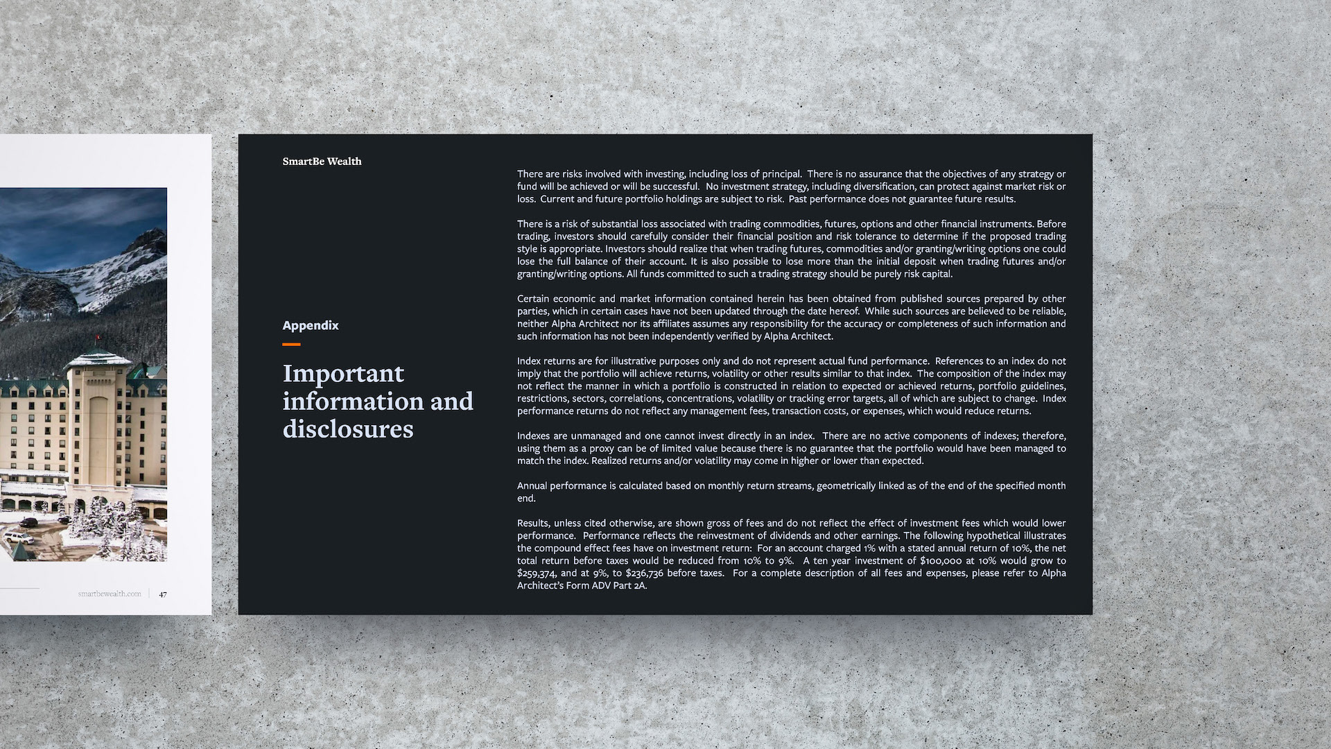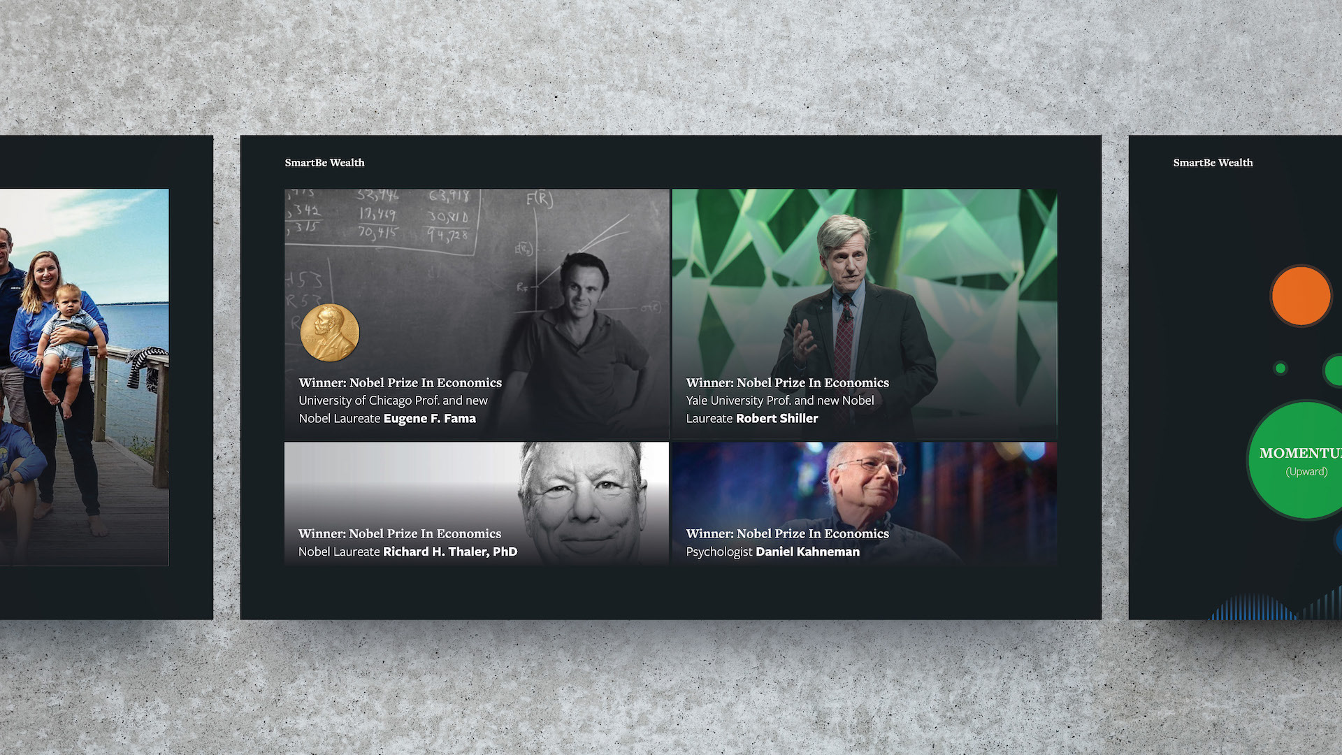 The SmartBe brand was built to steer clear of the classic cookie cutter investment manager brand look (vanilla lifestyle istock and "safe" colour schemes). SmartBe had previous invested in custom illustrations that thematically suggested attractive features of investing (risk aversion, sustainability etc). When designing this presentation series, I wanted to capture the friendly, smart, approachable brand roots SmartBe was planting. I accomplished this primarily with gentle fades, simplistic layouts and an abundance of whitespace.
