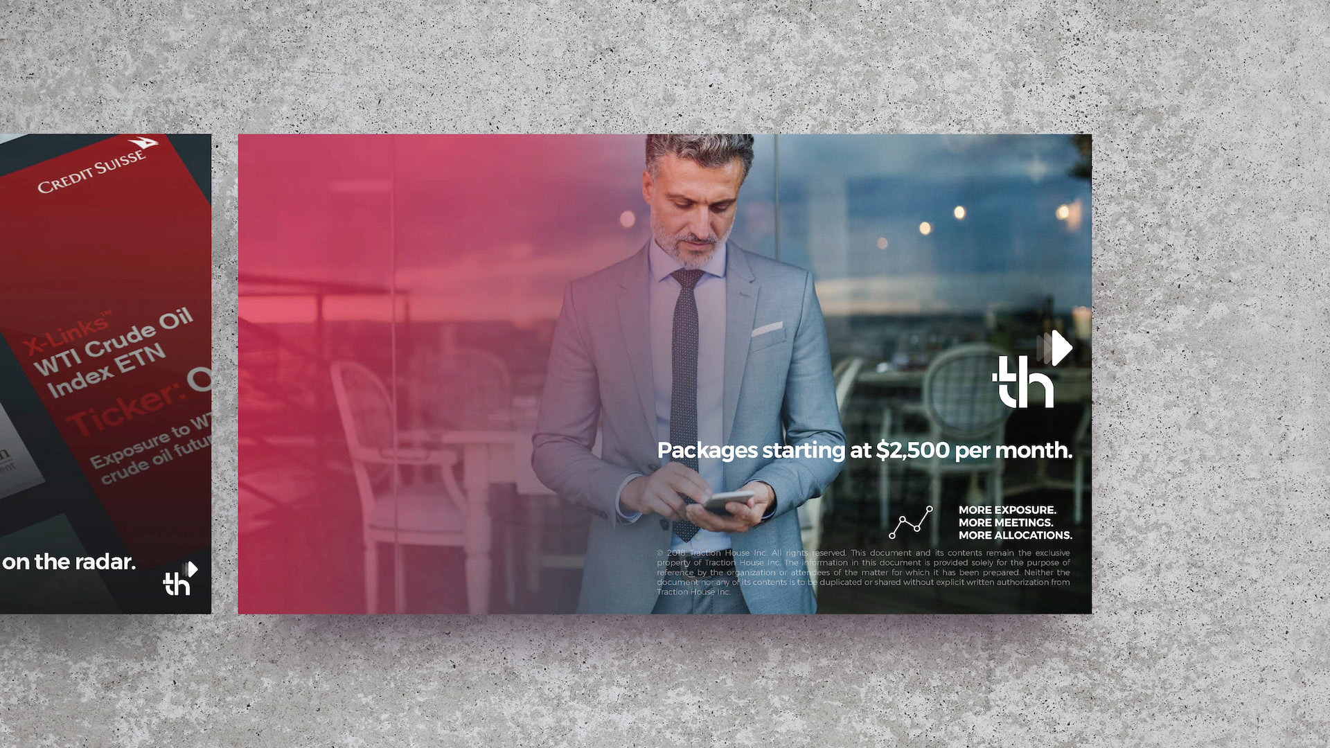 This was the 2nd iteration of the Traction House brand, in use in the later half of 2018 and into early 2019. Charcoal bluish-grey tones with a violet red highlight was appealing for a short time. I got over this look and have since moved on but it served a decent look during its time. This sales deck often served as a mechanism to describe to asset manager clients how social media is used to attract investors to their firm. I used isometric illustrations of accredited and institutional investors in their natural habitat (buildings and city centres) with their heads buried in their phones, indicating that this is where all the attention lies, which positioned us to visually stress the importance of having your brand everywhere online (always on, omni channel).