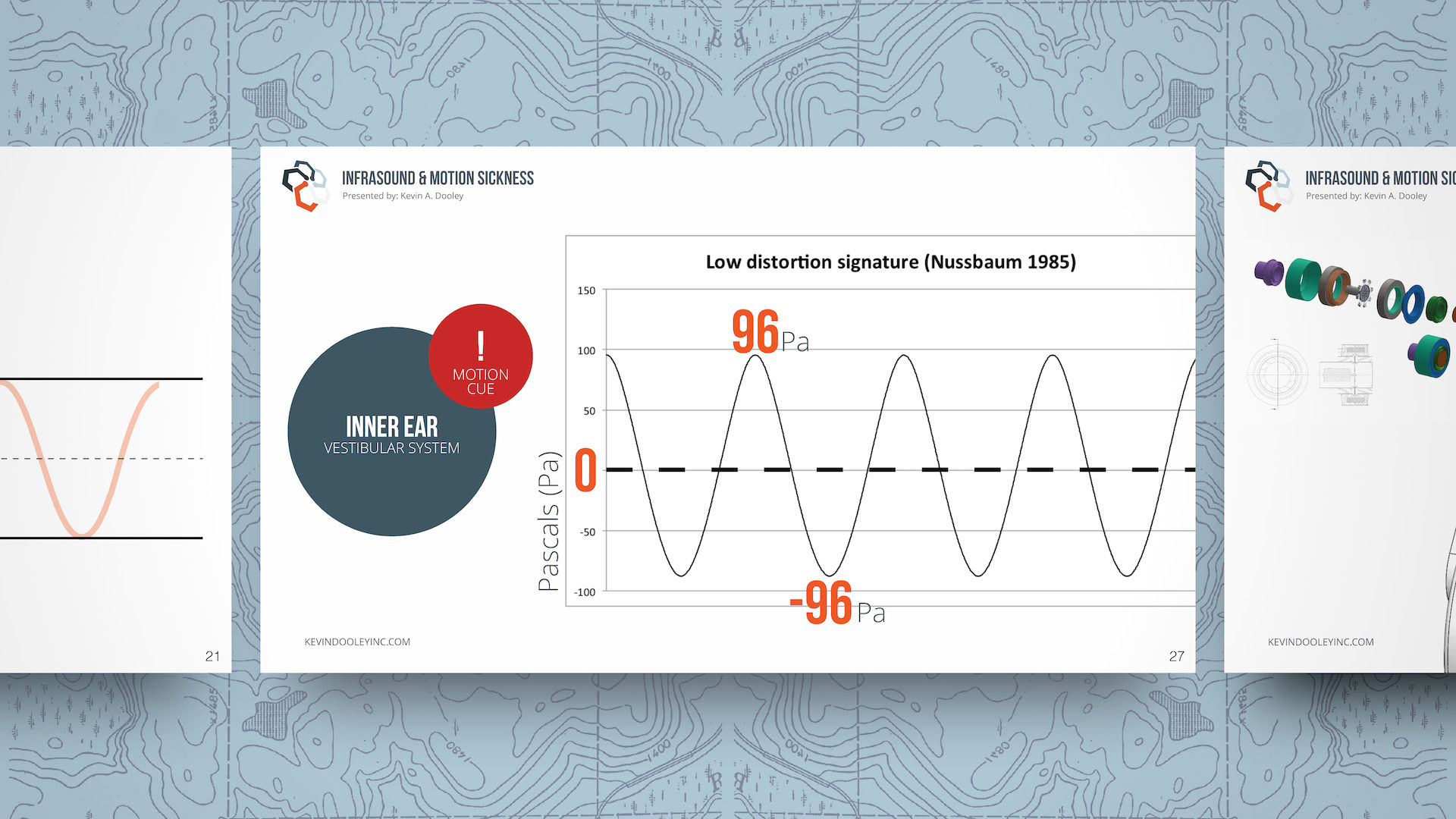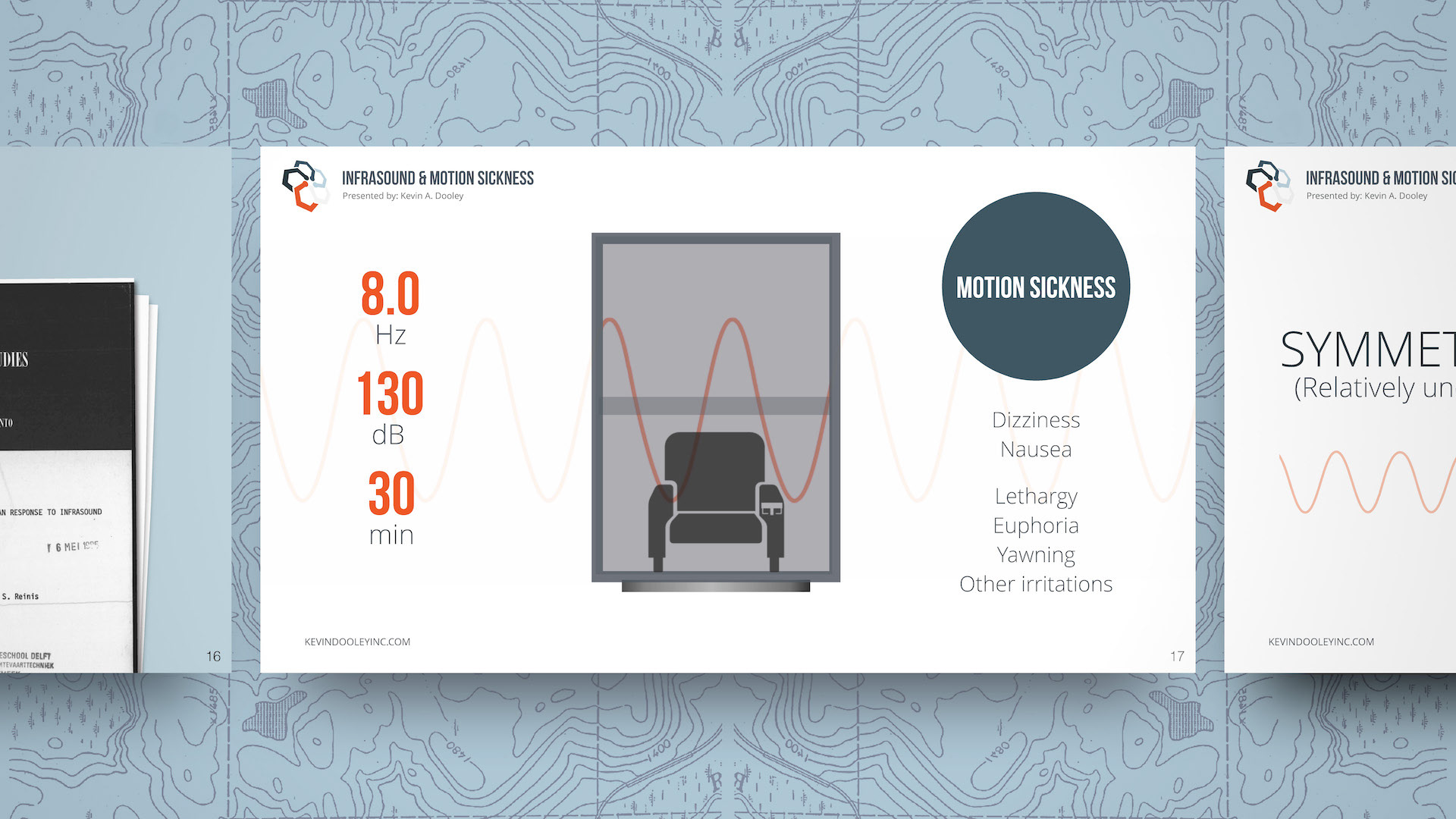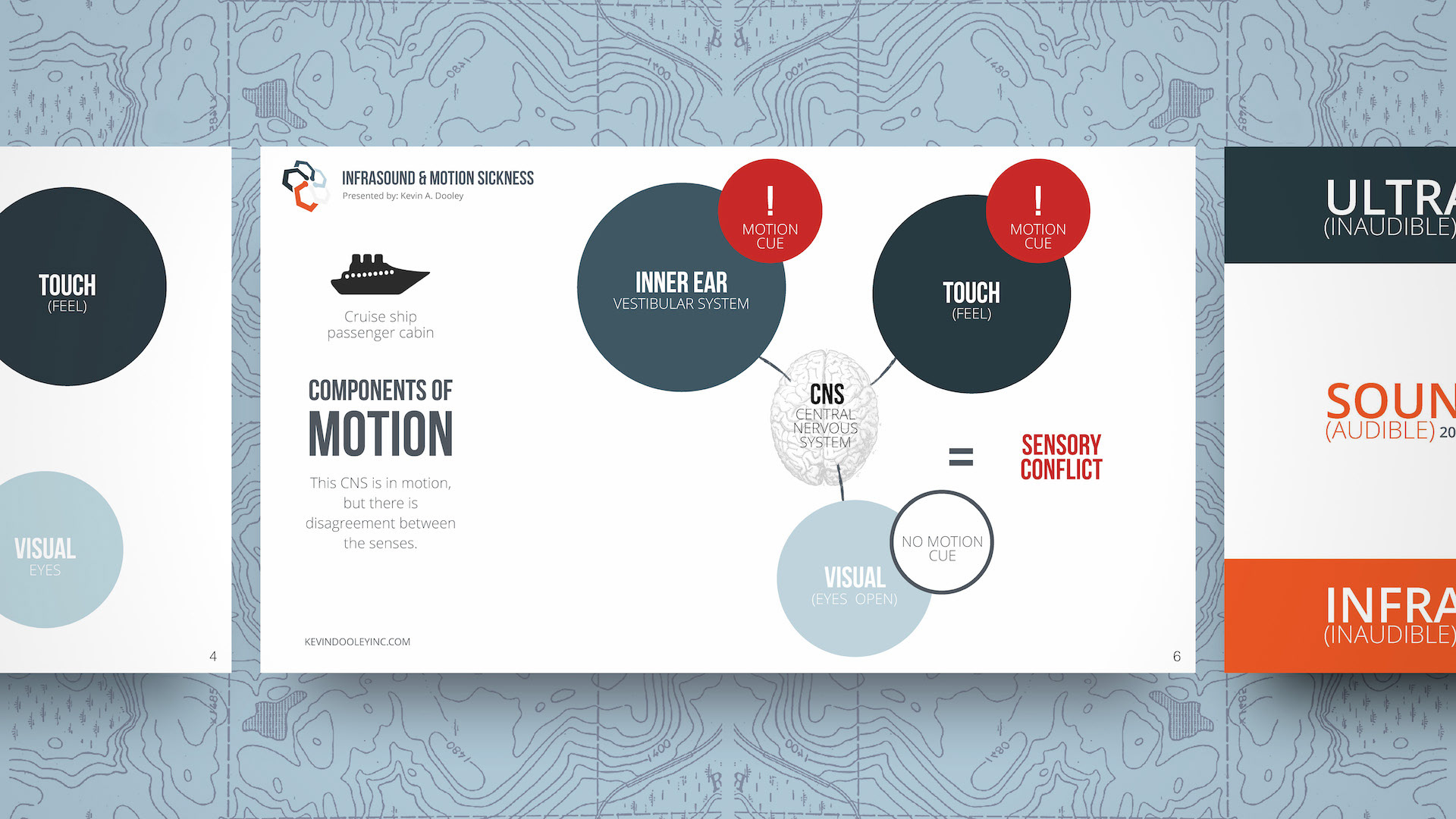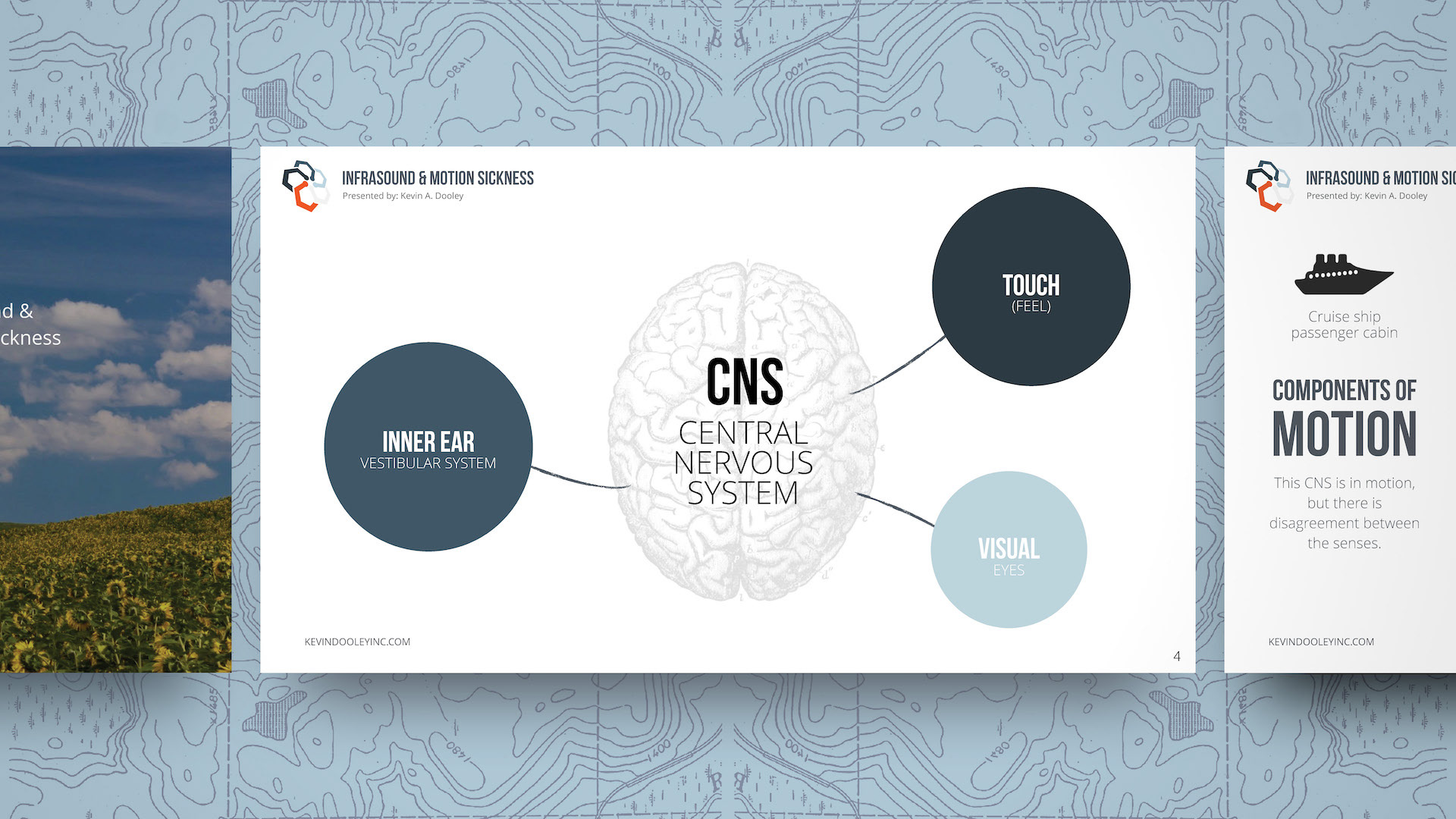 This was the most technically demanding presentation I've ever had to design. Much of what is on these slides are direct from research papers and scientific journals, along with Kevin's personal research findings. The elephant in the room that I had to get across to people was how a wind turbine could potentially make some people feel sick that lived nearby. Kevin is researching infrasonic (low frequency) barometric pressure fluctuations that come from wind turbines as a cause of sensory conflicts in some people (motion sickness effects). Visually, I designed diagrams that would clearly illustrate how motion sickness happens in some people, and how our sensory system can be effected by infrasonic inputs. It was quite a task. I'll never forget this one!