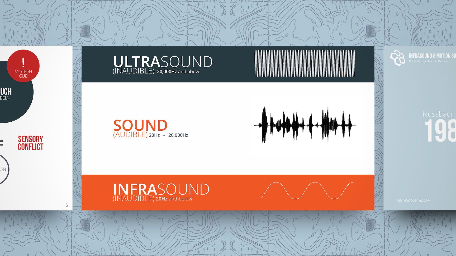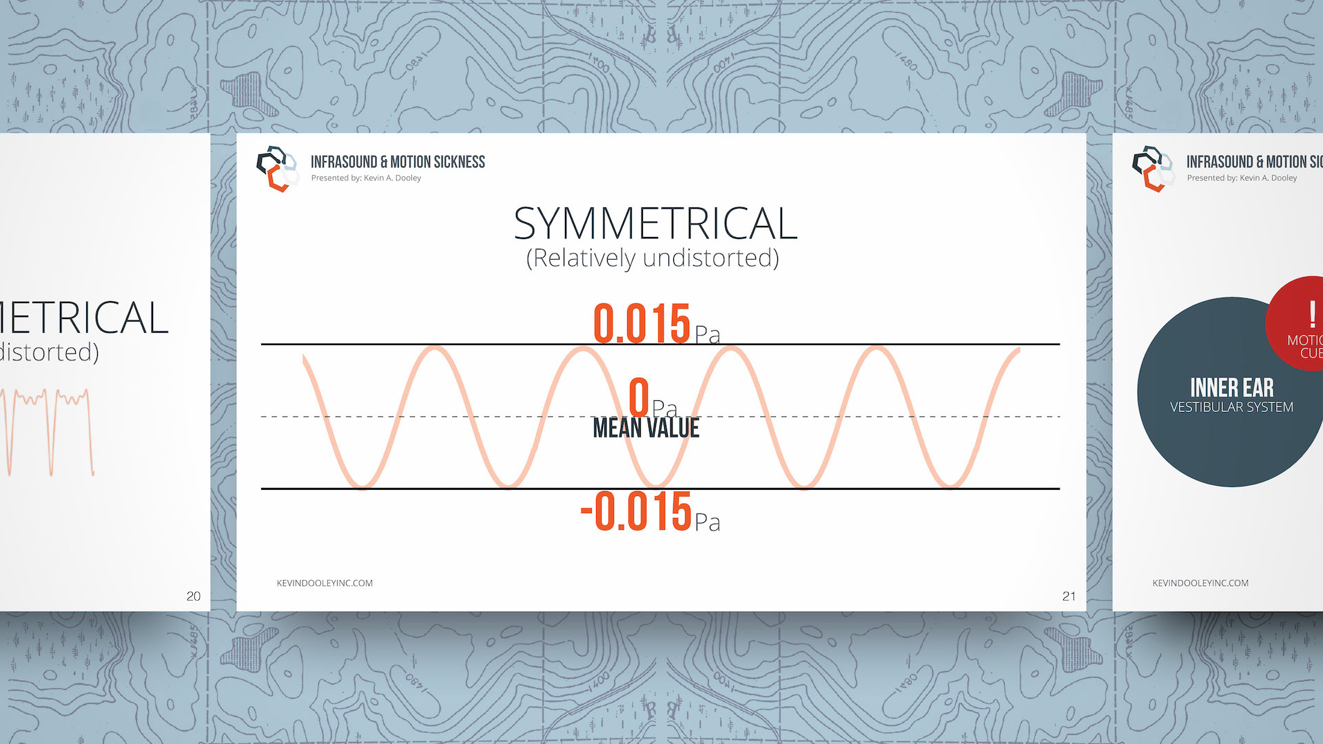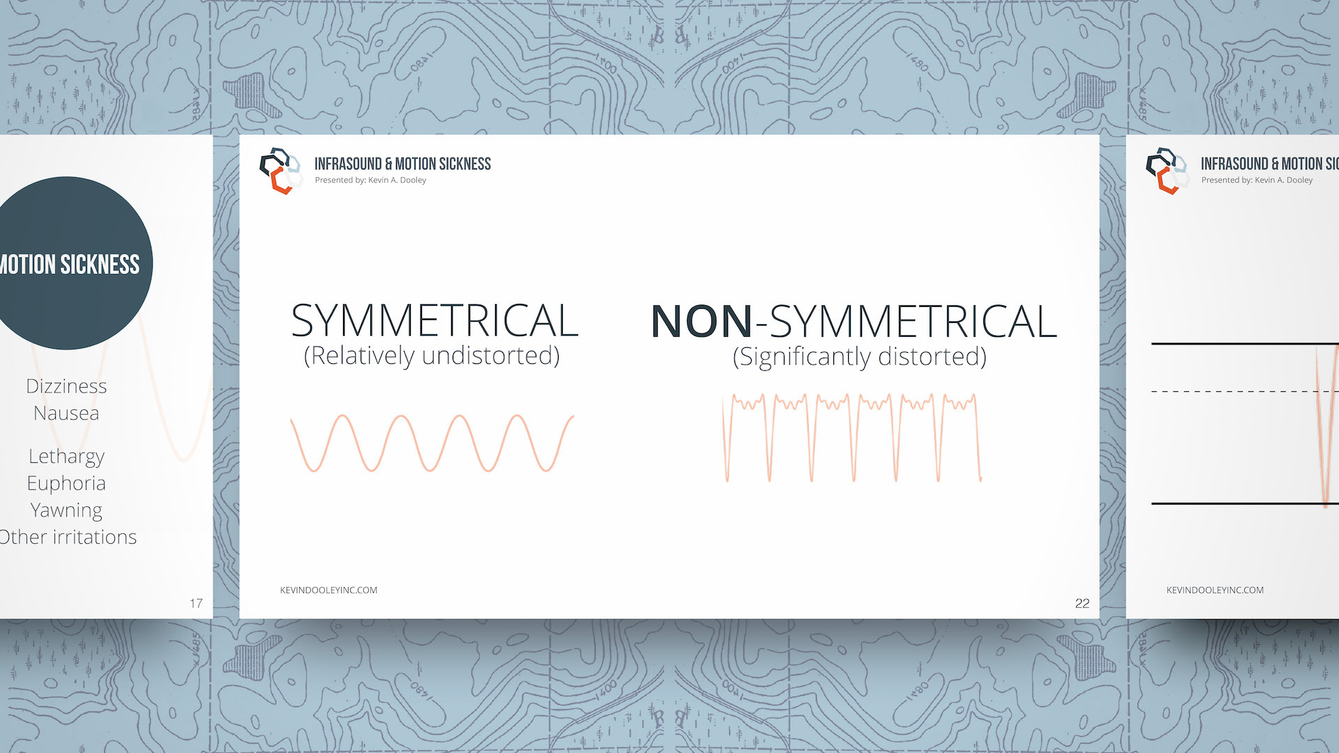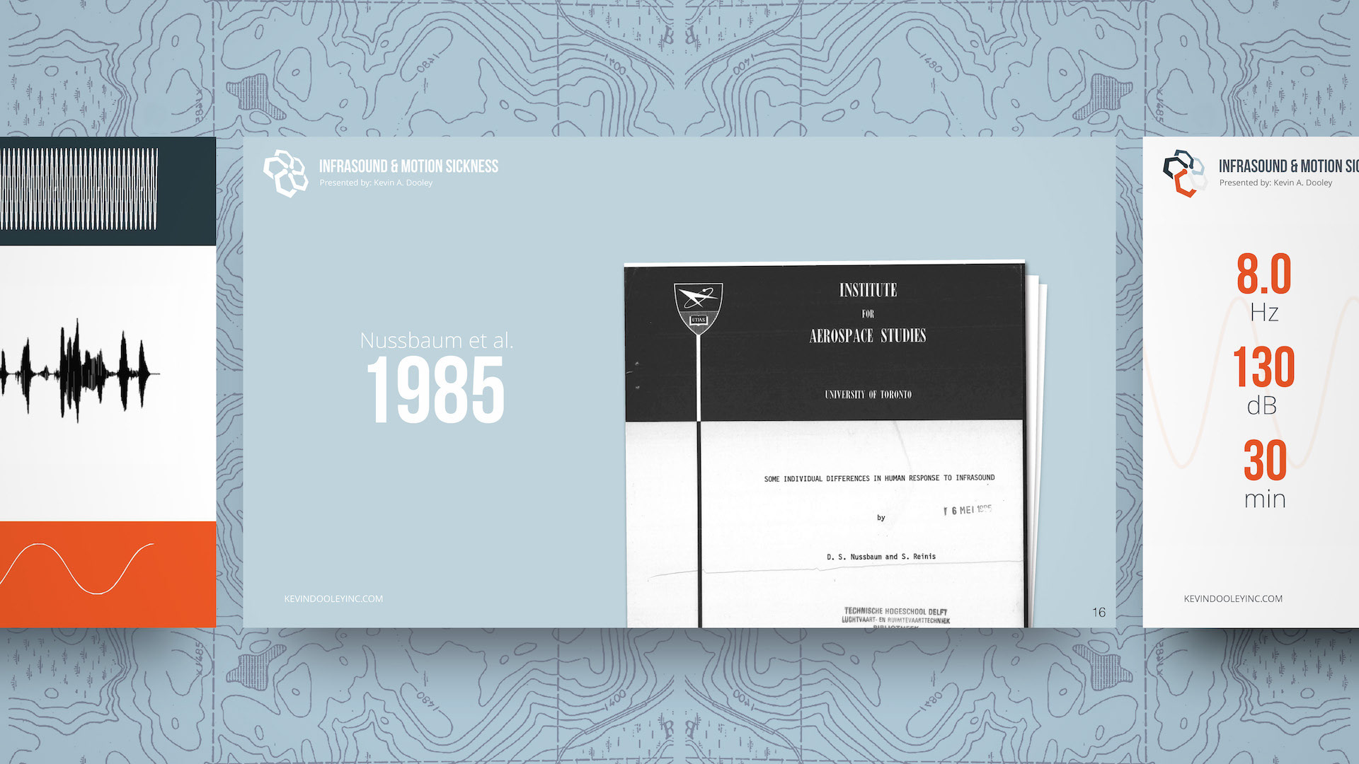 This was the most technically demanding presentation I've ever had to design. Much of what is on these slides are direct from research papers and scientific journals, along with Kevin's personal research findings. The elephant in the room that I had to get across to people was how a wind turbine could potentially make some people feel sick that lived nearby. Kevin is researching infrasonic (low frequency) barometric pressure fluctuations that come from wind turbines as a cause of sensory conflicts in some people (motion sickness effects). Visually, I designed diagrams that would clearly illustrate how motion sickness happens in some people, and how our sensory system can be effected by infrasonic inputs. It was quite a task. I'll never forget this one!