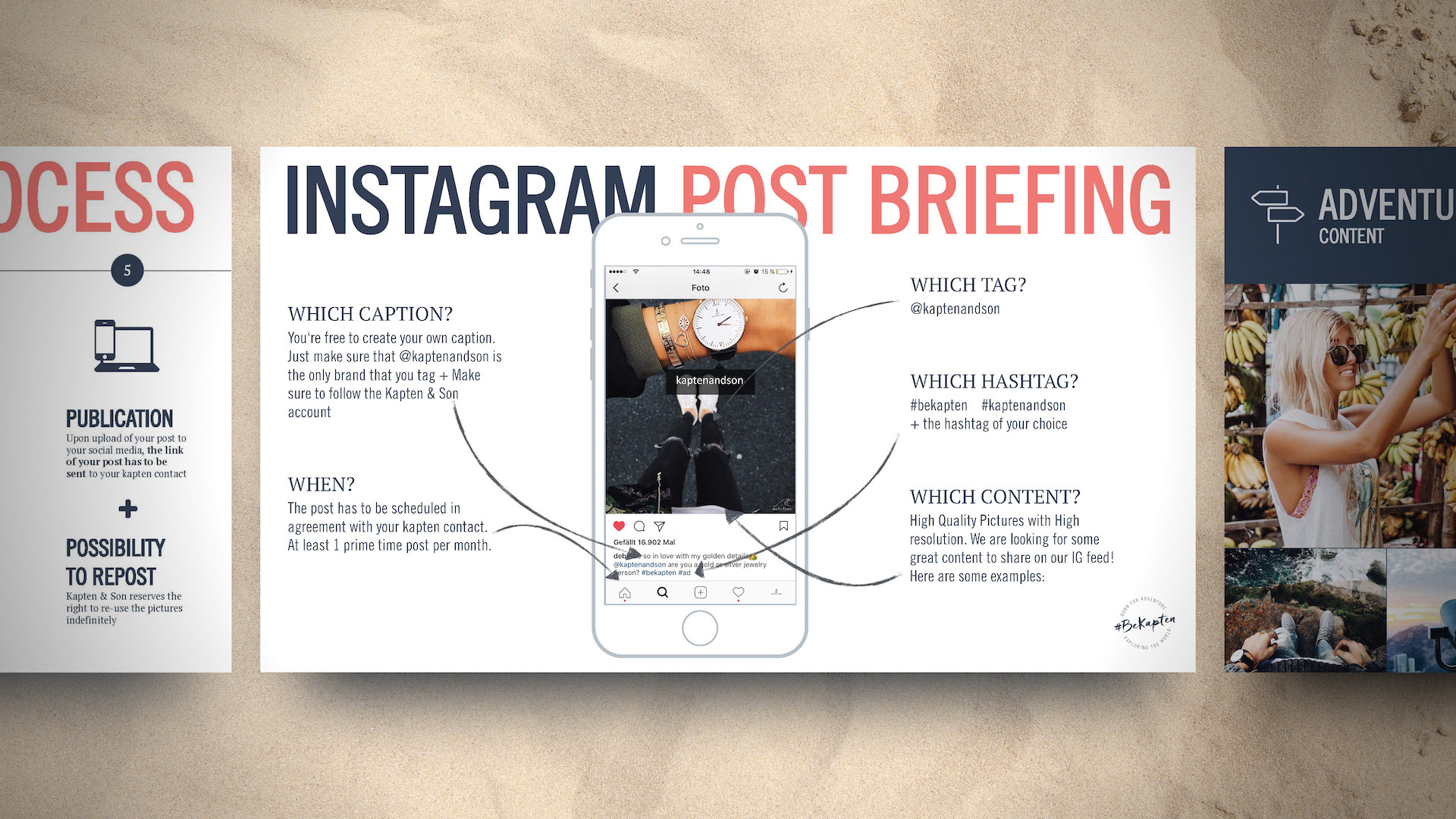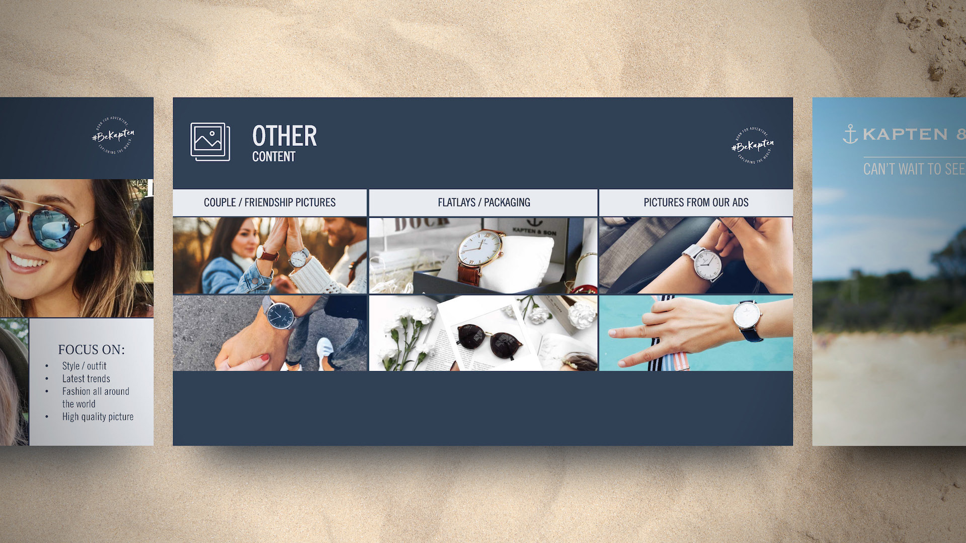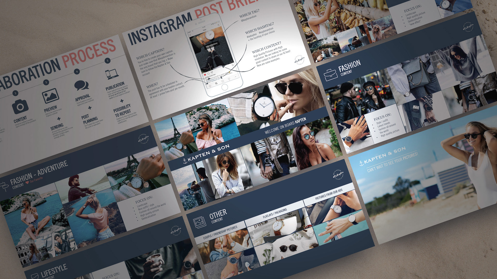 Kapten & Son already had a strong brand guide, so it made designing this series much easier. Throughout, I wanted to maintain a hint of nautical with a play between nautical blue overlays, and pearl white backdrops. I was also lifestyle photo-heavy, most of which are pieces from actual influencers wearing Kapten & Son products. I wanted influencers to see themselves in those photos, and I wanted them seeing the momentum already underway in the influencer community. Graphically, I laid out elements in a fun and engaging way, sometimes breaking rules and running large text off the slide. I also wanted to suggest a treasure map feel with dotted arrows between objects and maps that interacted with photos. Overall I'm pleased with how these turned out.