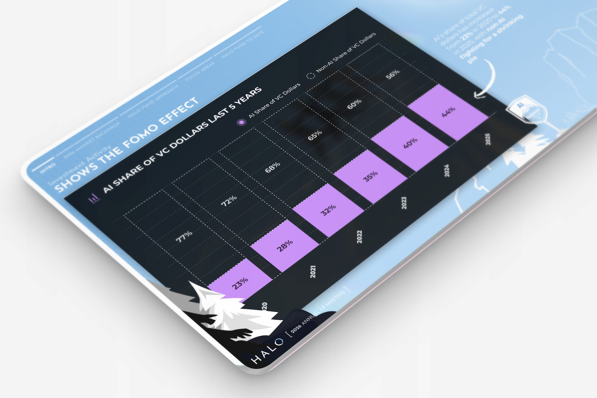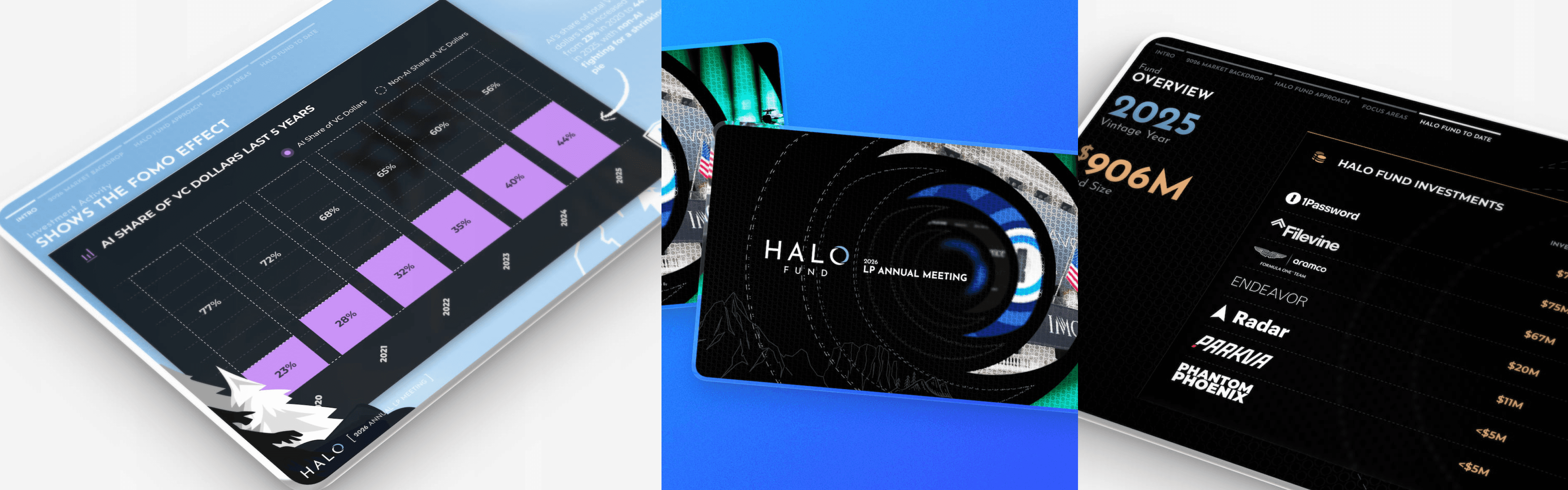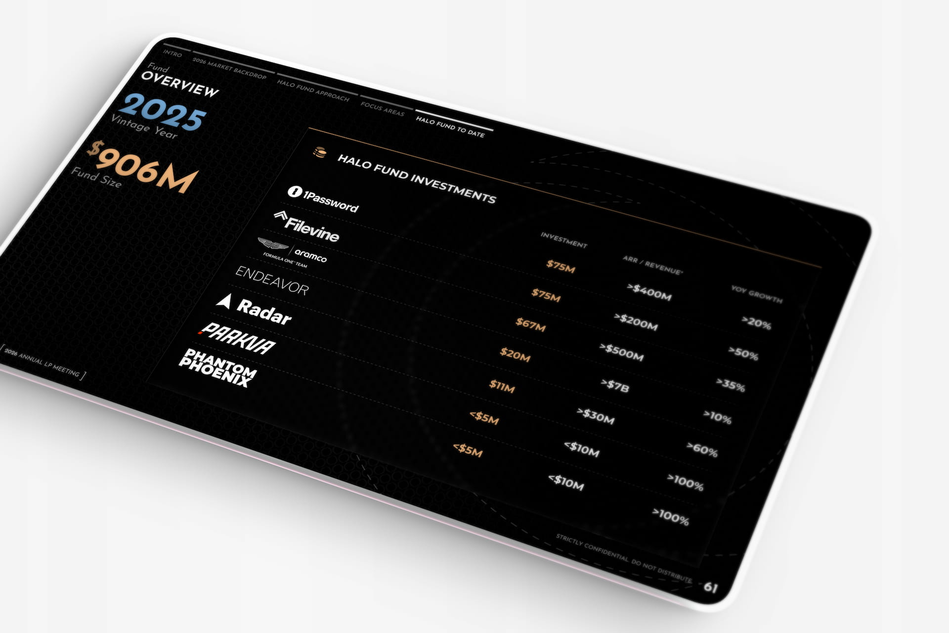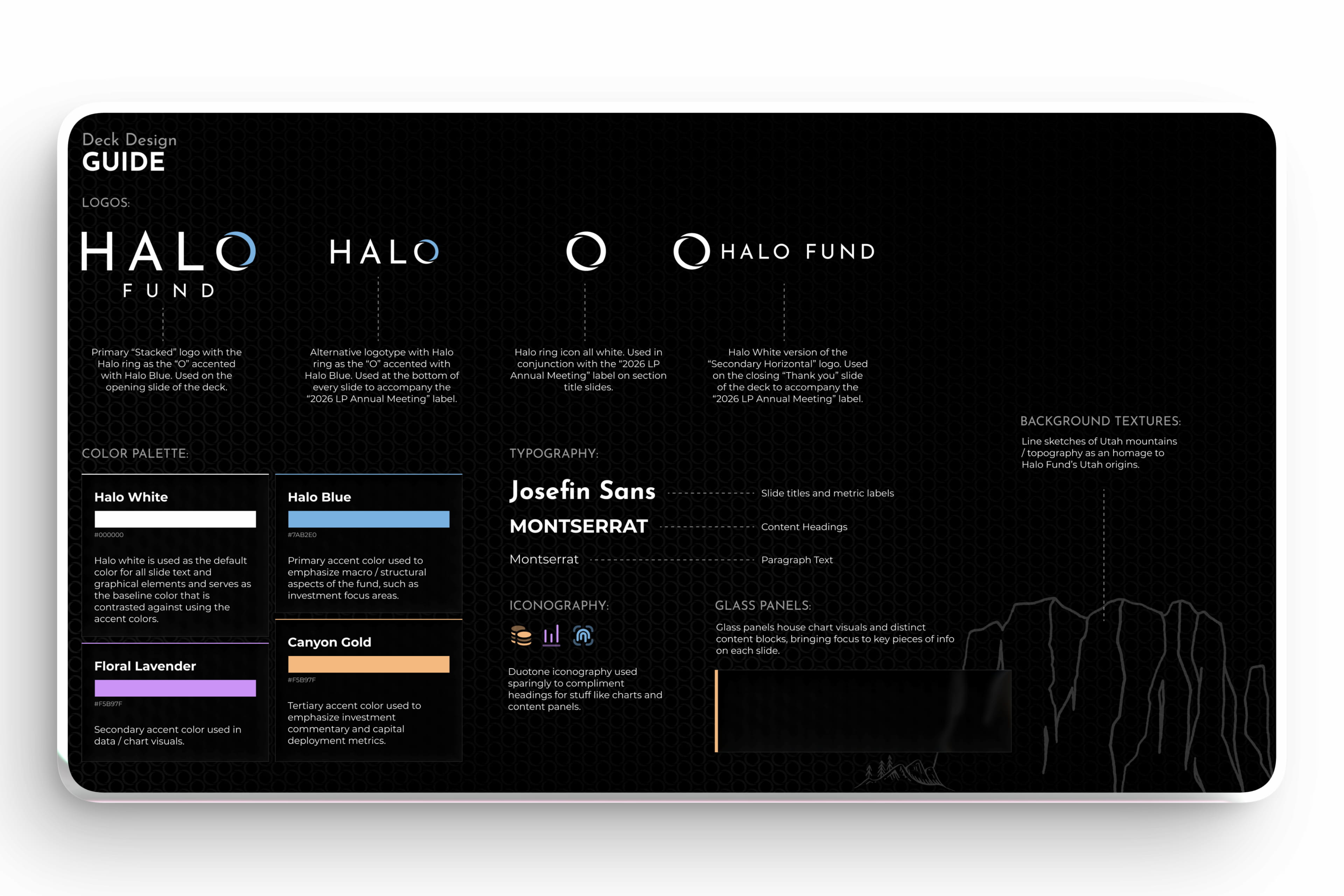The Halo Fund Limited Partner Annual Update Deck remaster will transform the design aesthetic of the provided powerpoint outline into an ultra clean and clear visual PDF deck to be presented live to the fund's LPs.